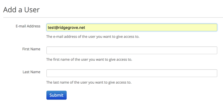 - Under the Add a User section, add the email address of the person you wish to make an admin, and (optionally) a first and last name