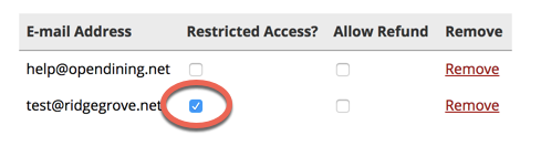 - Check the Restricted Access? checkbox next to the the email address of the admin you just created (checking/unchecking this box will automatically save the setting; no need to click the Submit button after toggling this setting)